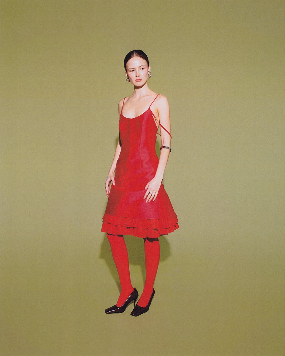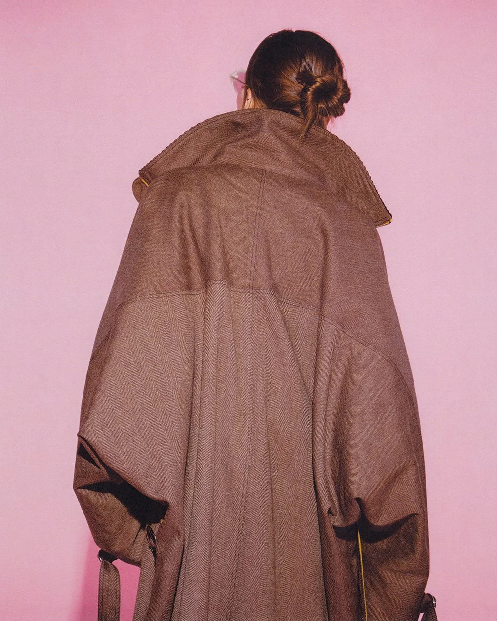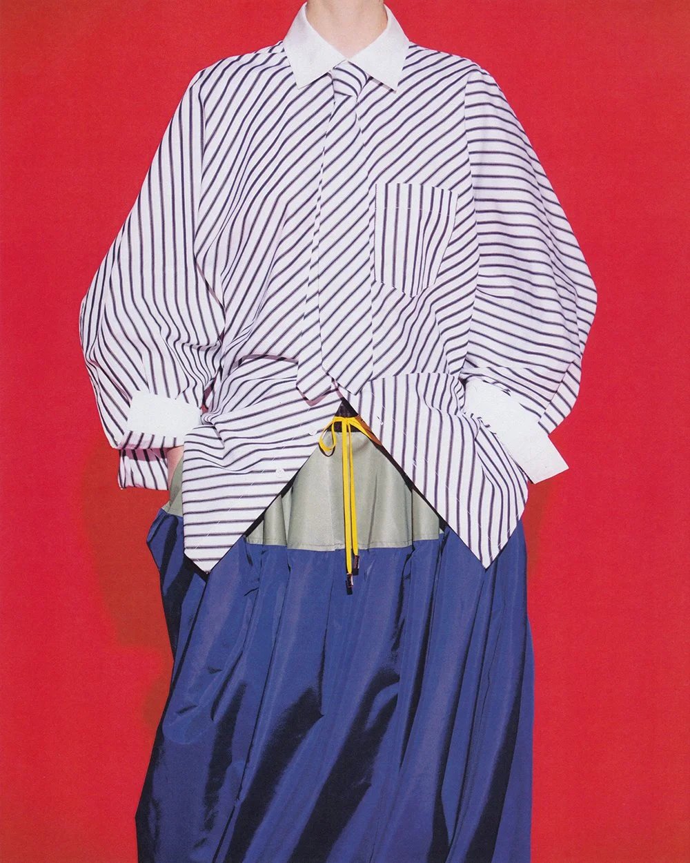 F/W ‘26 is the older sister to S/S ‘26, refining the vocabulary established in the debut while embracing a more emotionally mature register. The collection is decisively fall in tone, driven by heavier wools, corduroys, plaids, and stripes, and a palette that feels deeper and more grounded. While the girl remains the same, she has grown more sophisticated—minis give way to midis, silhouettes allow for layering, and pattern mixing becomes more confident. Developed over a shorter, more immediate timeline, the collection reflects a period of focused refinement. Alongside this clarity, the designers’ shared cultural fixations subtly surface: the heightened femininity and ritualized glamour of Girls Next Door, and the theatricality and pageantry encountered at the New York Renaissance Faire. These references are not literal, but inform the collection’s balance of polish, eccentricity, and play. Key pieces include a classic collared shirt with exaggerated dolman sleeves, a bias-cut pant, reworked bustle forms, and a classic men’s necktie introduced as a styling element within the wardrobe.
